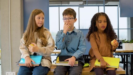 Back to school Happy diverse junior schoolchildren group looking at camera standing in classroom. Smiling multiethnic cool kids boys and girls friends posing for group portrait together