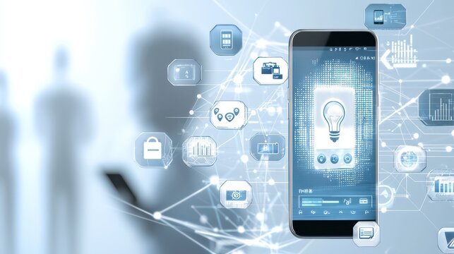 Smartphone displaying a futuristic digital interface with various connected icons and data visualizations showcasing advanced technological capabilities and connectivity