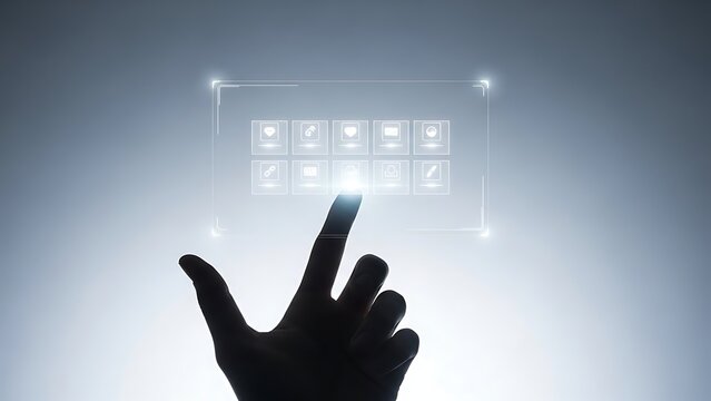 Hand interacting with futuristic holographic interface displaying various icons in a sleek modern design