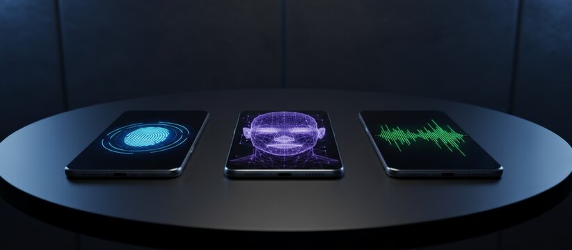 Smartphones displaying various biometric identification methods including fingerprint scanning, face recognition, and voice authentication, representing modern security and data protection