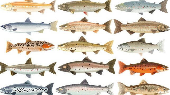 A collection of illustrated fish species showcasing various types and colors for educational purposes.