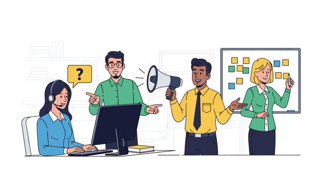 A diverse team of business professionals collaborates on strategic initiatives, providing customer support and presenting innovative ideas in a modern office setting.