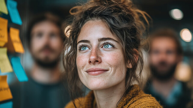 Young woman with glasses engaged in discussion in a team meeting room with colleagues in the background