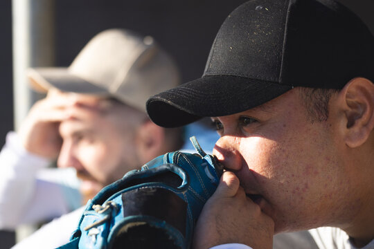 Diverse male teammates in baseball caps sitting on dugout bench, holding blue glove shielding eyes