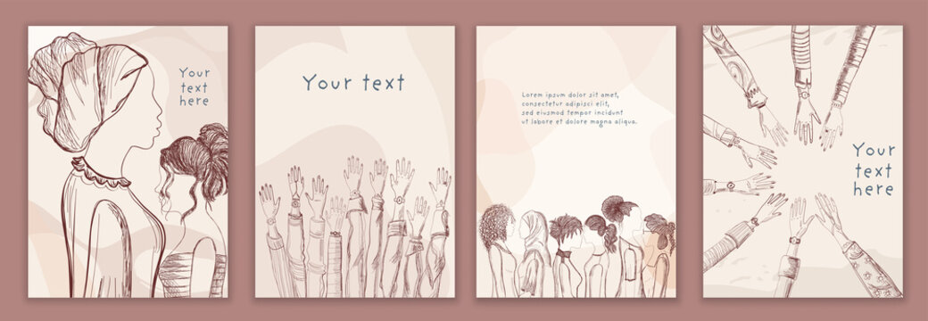 Group diverse women and girls. Sketch of multicultural women. Female social network community. Racial equality. Allyship. Empowerment. Head and hands. Brochure - poster -editable template