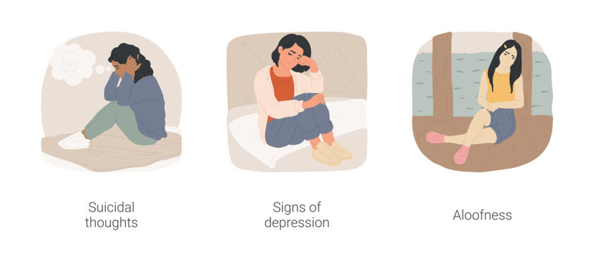 Teenagers negative thoughts isolated cartoon vector illustration set. Suicidal thoughts, sad girl lying in bed thinking about death, show signs of depression, teenage aloofness vector cartoon.
