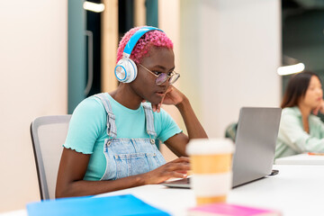 Young smiling woman with Afro braids and plastic folder looking at camera behind multiracial coworkers