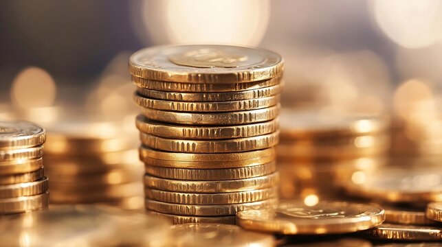 Stacked Gold Coins Glimmering Under Soft Light in a Wealthy Business Setting : Generative AI