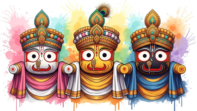Jagannath deity artwork showing vibrant divine idols with colorful traditional ornaments expressive faces spiritual presence cultural heritage festive atmosphere bright background artistic sacred