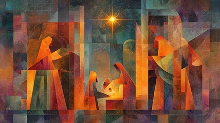 Abstract artwork showing the holy family with mary and joseph kneeling the manger, a prominent shining the scene above star