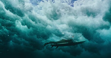 Underwater view of surfer girl diving under ocean wave, duck diving below the surface, slow motion