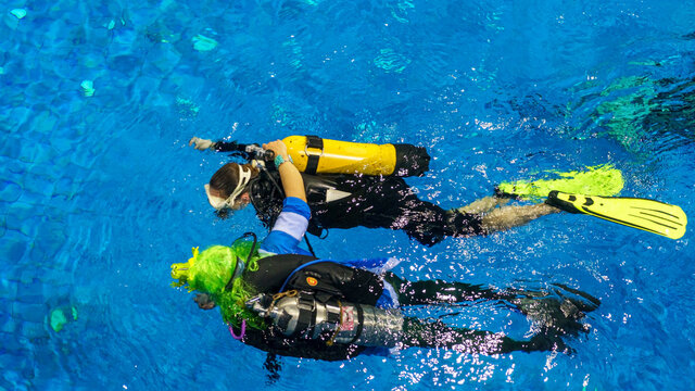 Diving instructor and students. Instructor teaches students to dive in the swimming pool. Scuba diving school concept.