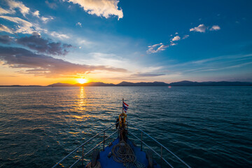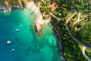 Aerial view of scuba diving boat or recreational vessel anchoring over turquoise clear water at Racha Island or Koh Racha, A popular destination for summer vacation in Phuket, Thailand.