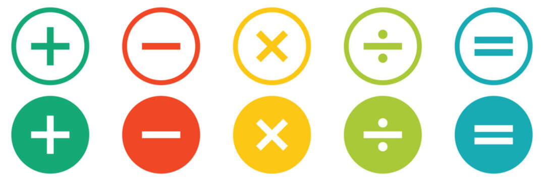 Plus, minus, multiply, divide and equal sign icon design set. Addition, subtraction, multiplication, division, equal sign, icon symbol. Mathematical symbol icon.