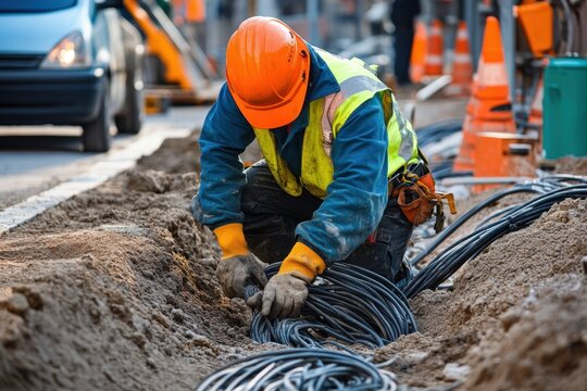 Underground cable installation by construction worker urban construction site action photography industrial environment close-up view infrastructure development