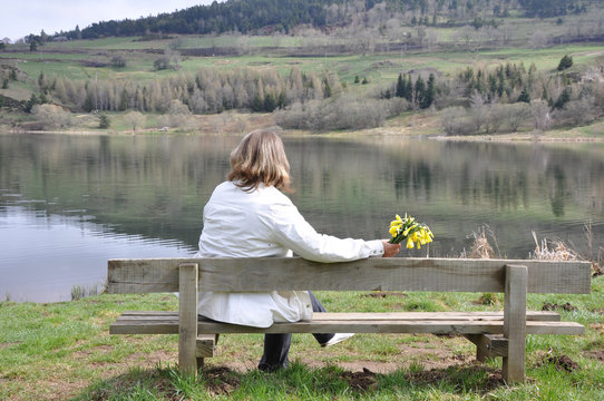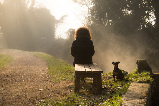 Donna seduta su una panchina con cane in una mattina con foschia lungo un sentiero