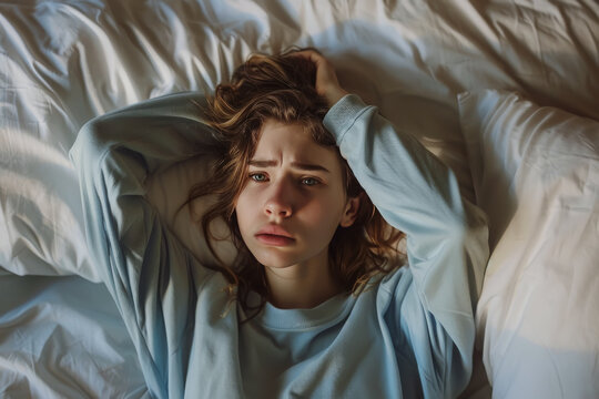 Mujer joven con cara de sufrimiento tumbada sobre una cama agarrándose la cabeza con sus manos sufriendo insomnio