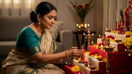 Indian woman in a traditional sari arranges a golu doll display on a home altar for the navratri festival, a scene of hindu faith, spirituality and cultural heritage