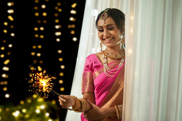 Woman looking at the sparkler in her hand  with a smile on the occasion of Diwali
