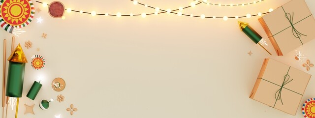 Diwali banner. Background design of realistic red gift box, 3d render fireworks and fire cracker, Horizontal diwali poster, headers for website