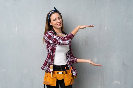 Craftsmen or electrician woman holding copyspace to insert an ad