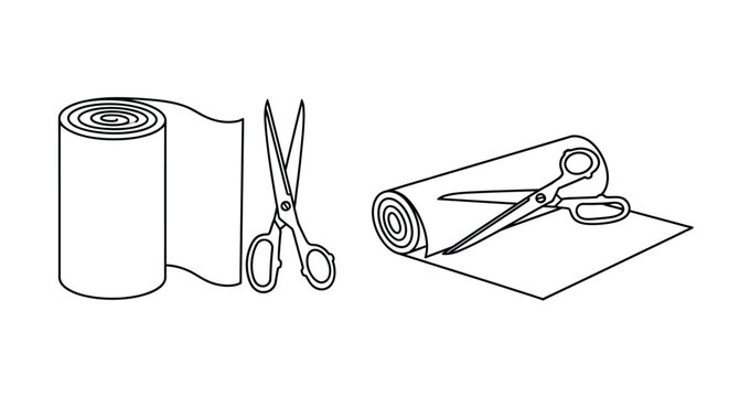 Line art illustration of ribbon roll scissors and a cut ribbon piece