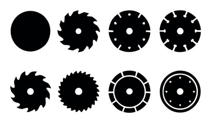 Collection of black circular saw blades with sharp teeth and central holes cutting tool