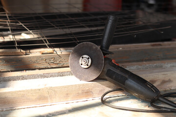 Angle grinders, power tools for construction and repair work. Tool for cutting and grinding hard materials. Old angle grinder with cord. Repair work in the country. Grinder with a metal disc