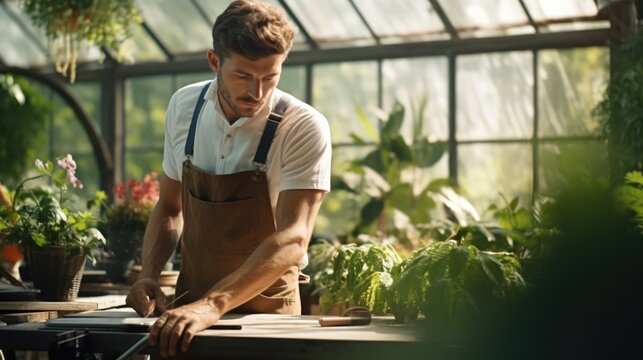 A man is cutting a piece of wood in a greenhouse. Ideal for gardening and DIY projects