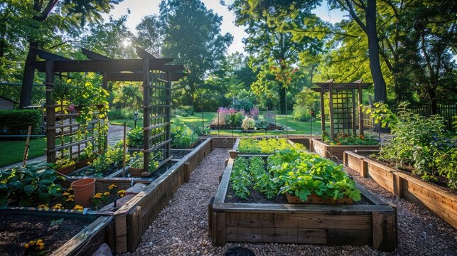 This small urban backyard garden contains square raised planting beds for growing vegetables and herbs throughout the summer.  Edging is used to keep grass out, and mulch helps keep weeds down.