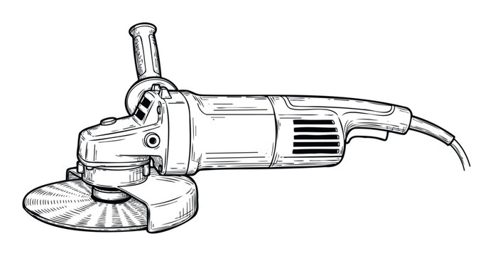Classic black and white line drawing of an industrial angle grinder power tool, perfect for engineering diagrams, hardware store advertisements, or DIY project guides requiring a hand tool