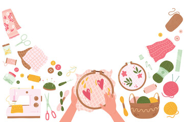 Creative art master class, lesson and workshop for children banner vector illustration. Cartoon hands holding hoop with embroidery, tools for sewing and knitting background. Education, hobby concept