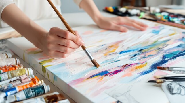 Paintbrush, hands and tools for painting in studio, color and craft in small business and above. Workshop, equipment and supplies in jars or container for project, collaboration and people in store
