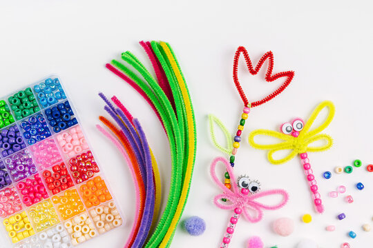 Beaded Pipe Cleaner flowers and dragonflies. Easy spring kids crafts. Different multi-colored supplies and materials for DIY art activity for kids. Children's crafts, creativity and  hobby.