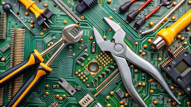Wrench and screwdriver surrounded by electronic components, wires, and circuit boards, symbolizing electronic repair and DIY troubleshooting in a modern workshop environment.