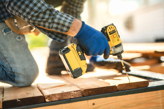 Handyman worker making patio outside close to a pool installing floor.