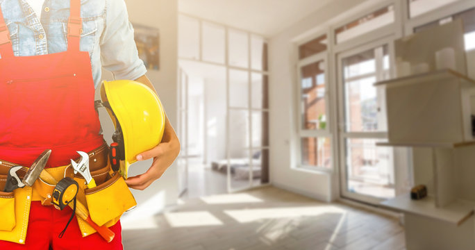 Builder handyman with construction tools. House renovation background.