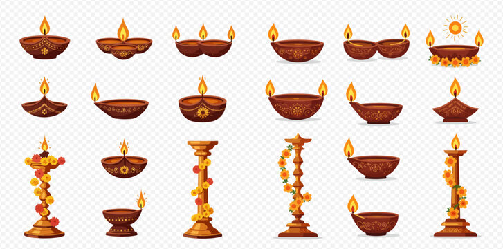 Collection of traditional Indian oil lamps, diyas, and candle stands, decorated with flowers, for Diwali or other festivals.