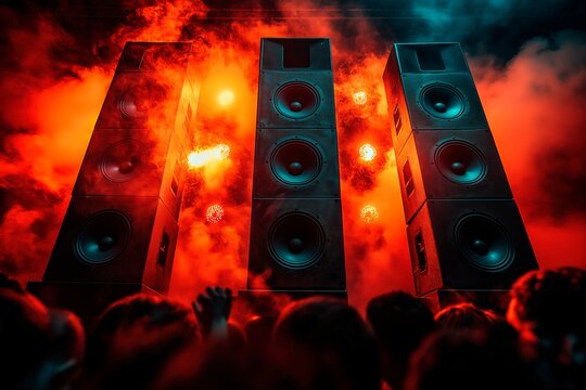 Energy-filled performance with powerful speakers in a venue with copy space for text, dj banner advertising, live music advertisement