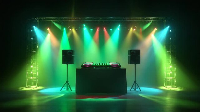 Vector art of a stylish stage with a dj booth and a glowing dance floor, illuminated by colorful spotlights and modern fixtures
