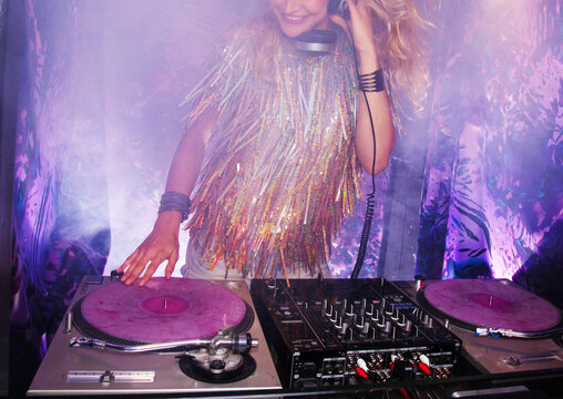 Female dj mixing music in vibrant setting