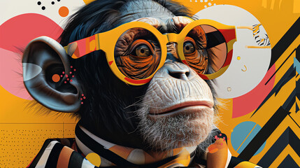 Stylish chimpanzee dj with headphones: colorful illustration of a cool monkey wearing glasses and headphones on an abstract background