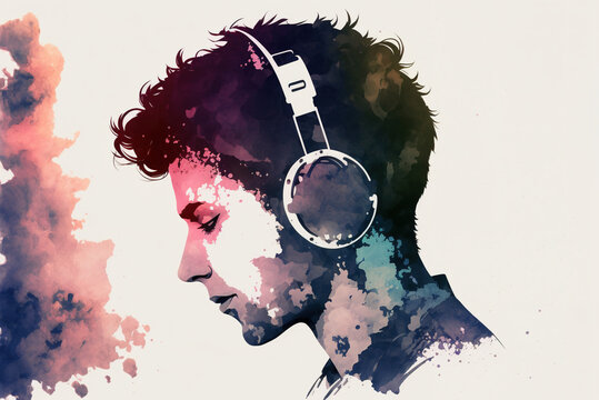 Silhouette of a girl listens to music with headphones in the style of acrylic paints on canvas with heavy  brushstrokes and color splashes.