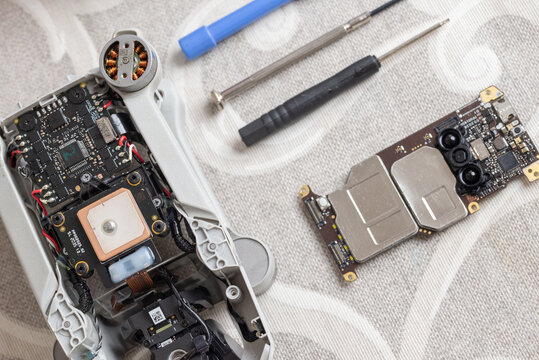 DJI Mavic 2 - Flying in the dark, on black background. Closeup on black background.