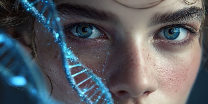 Beautiful Young Woman with DNA Strand Overlay Representing Biotechnology and Skincare