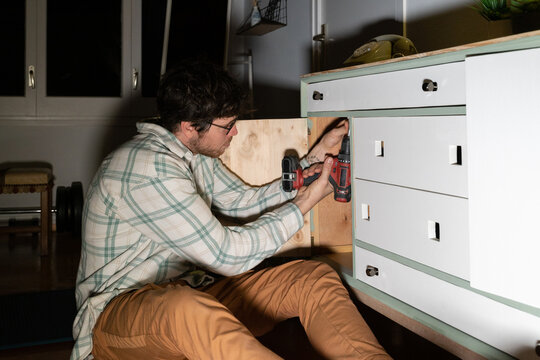 Young man at home repairing chest of drawers