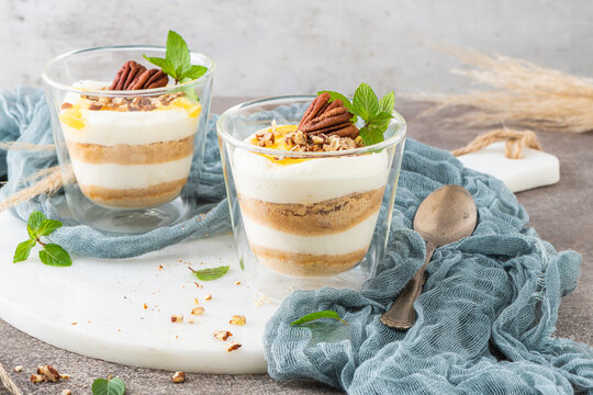 Natas do Ceu is a traditional Portuguese dessert made with cream, eggs and biscuits decorated with pecan nuts and mint leaves