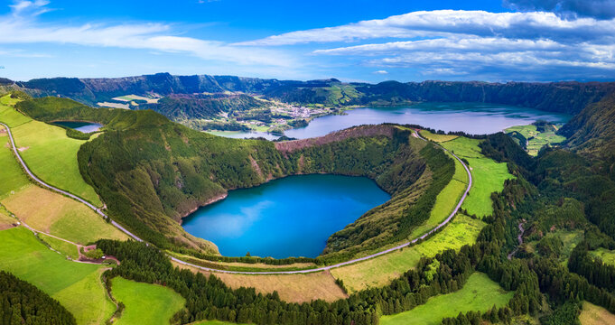 Azores island most beautiful scenic places - wonderful emerald lakes Sete Cidades lagoons, high angle aerial view of Boca do inferno volcanic crater . Portugal, Sao Miguel