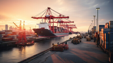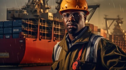 Conceptual image of international logistics, featuring a docker, looking at the unloading of a container ship by huge cranes in the