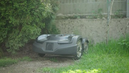 Still shot - Robotic lawn mower docking on charge station to fill up the batteries for another mowing session